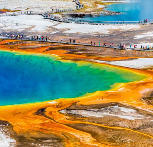 Resting atop a supervolcano, Yellowstone features America's largest high-altitude lake, winding rivers, and huge waterfalls. It's also punctuated by half of the world's geysers.